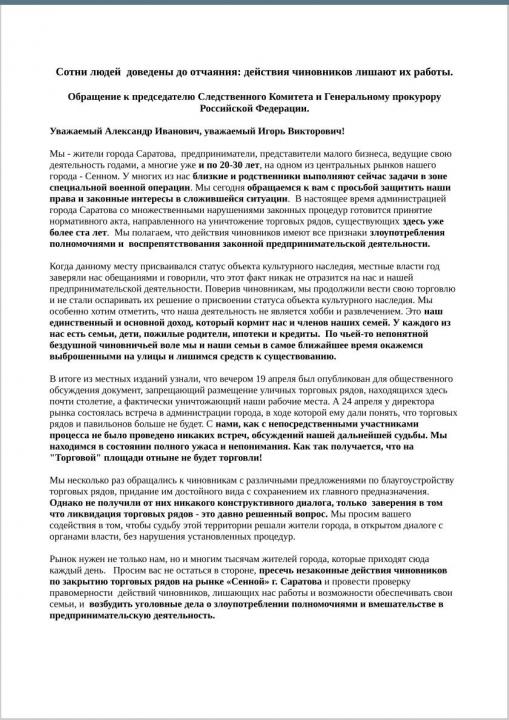 «Мы - жители города Саратова, предприниматели, представители малого бизнеса, ведущие свою деятельность годами, а многие уже и по 20-30 лет, на одном из центральных рынков нашего города - Сенном. У многих из нас близкие и родственники выполняют сейчас задачи в зоне специальной военной операции. Мы сегодня обращаемся к вам с просьбой защитить наши права и законные интересы в сложившейся ситуации. В настоящее время администрацией города Саратова со множественными нарушениями законных процедур готовится принятие нормативного акта, направленного на уничтожение торговых рядов, существующих здесь уже более ста лет. Мы полагаем, что действия чиновников имеют все признаки злоупотребления полномочиями и воспрепятствования законной предпринимательской деятельности», - заявили саратовцы в начале своего обращения.
