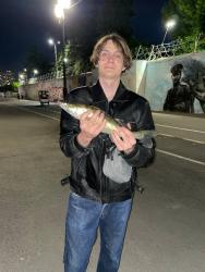 А вот юный житель областного центра поешл вечером на набережную потренироваться закидывать спининг и ему крупно повезло: он поймал судака. А вот еще одна рыбина оказалась столь большой, что ей удалось вырваться и скрыться в темных водах реки.