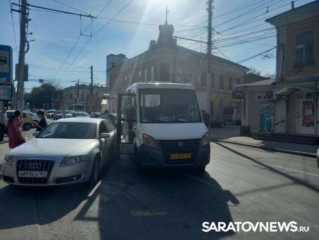 Несколько минут назад в Саратове на улице Чернышевского, у одноименной остановки, произошло ДТП. Маршрутное такси 105 столкнулось с легковым автомобилем.