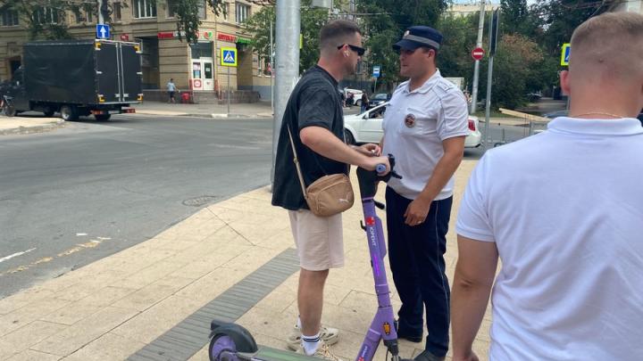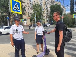 В Саратове представители мэрии и сотрудники Госавтоинспекции продолжают рейды по выявлению нарушений самокатчиками. Очередная проверка прошла на перекрестке улиц Рахова и Мичурина. Инспектора напоминали водителям электросамокатов о недопустимости движения на данном транспорте в сквере по улице Рахова, где установлен соответствующий запрещающий знак.
