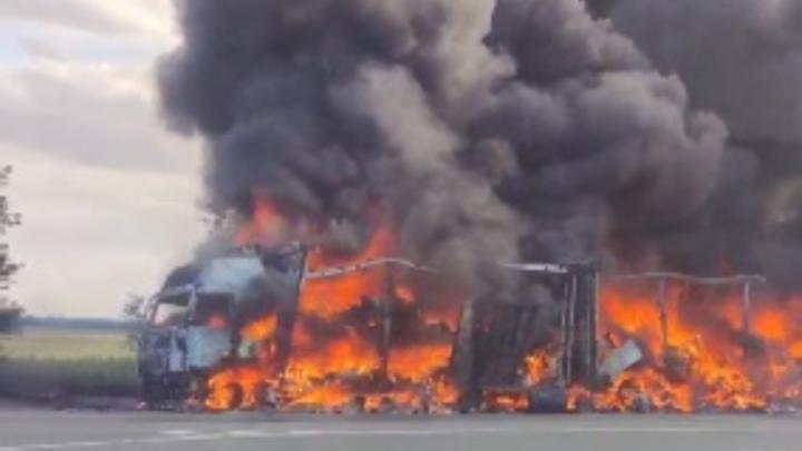 На месте происшествия работают два пожарных расчёта. Пока неизвестна причина возгорания. Фура выгорела полностью. Пострадавших нет.