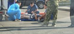 Пострадавшую женщину погрузили в носилках в автомобиль скорой помощи. По данным свидетелей ДТП, женщину задело бампером.