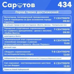 Можно будет посмотреть торжественные концерты, театрализованные представления, спортивные состязания, сап-карнавал, арт-ярмарку мастеров. Также саратовцы смогут поучаствовать в конкурсе рисунков на асфальте, мастер-классах.