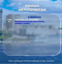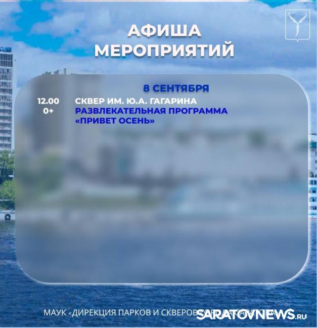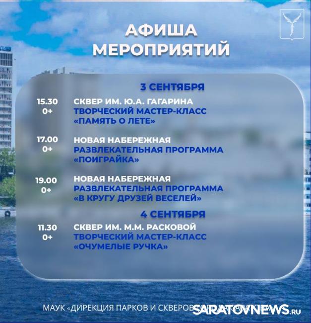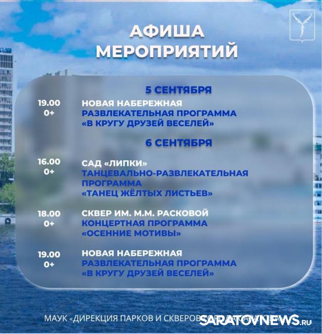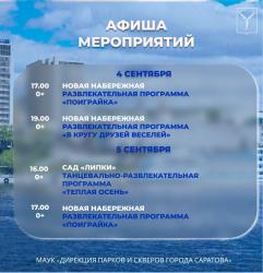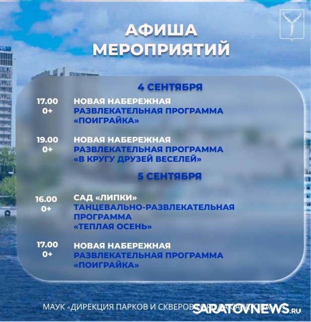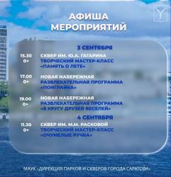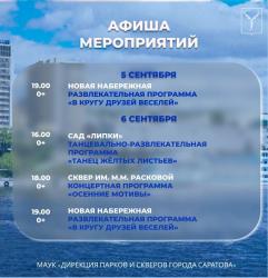 В Саратове опубликована афиша мероприятий со 2-го по 8-е сентября. Информация предоставлена администрацией города.