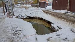 Яме несколько дней, она расположена рядом с тротуаром и заполнена водой. Сигнальные ленты оборваны. Тротуар скользкий, прохожим легко угодить в это коммунальное озеро с грязной водой. По этому тротуару ходят в том числе школьники. Яма угрожает жизни и здоровью жителей микрорайона.