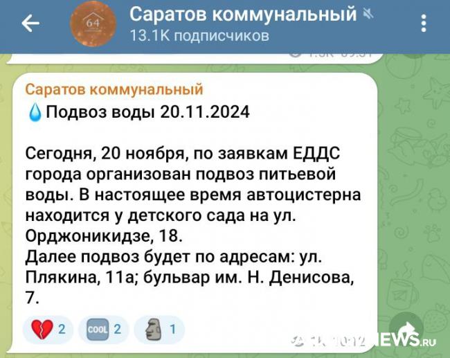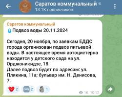 Работы планировали завершить 20 ноября до 8:00. Однако утром их продлили до 18.00. В связи с этим был организован подвоз питьевой воды. По сообщению тг-канала «Саратов коммунальный» в 10.12, автоцистерна находилась у детского сада на улице Орджоникидзе, 18. Жители микрорайона в течение часа после публикации объявления отправились за водой, но не нашли машину.