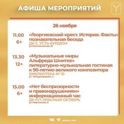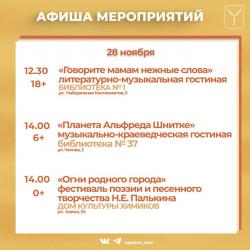 В течение недели жителей ждут анимационные программы, лекции, фестиваль поэзии, кинопрограмма, концерты, творческие вечера, познавательные программы. Вход бесплатный.