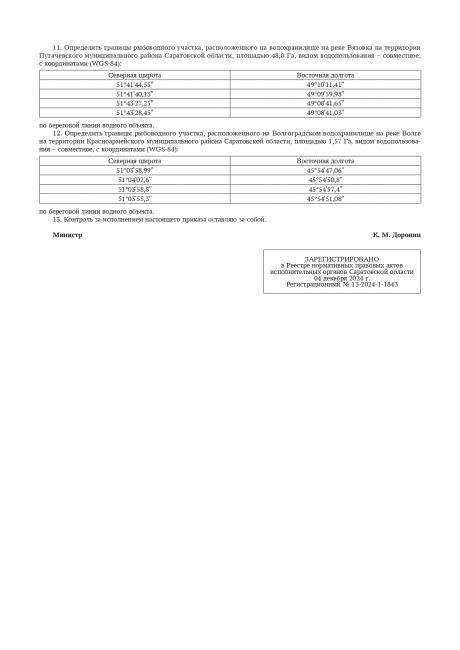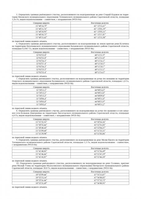В перечне участки на водохранилище на ручье, впадающем в реку Таловка на территории Калининского района; три участка на реке Елань в Первомайском образовании Балашовского района; на реке Старый Курдюм на территории Вязовского образования Татищевского муниципального района.