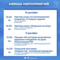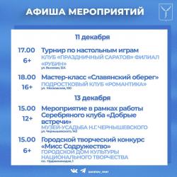 В течение недели можно сходить на концерты, творческие вечера, познавательные программы, турнир по настольным играм, выставки, мастер-классы к Новому году. Вход свободный.
