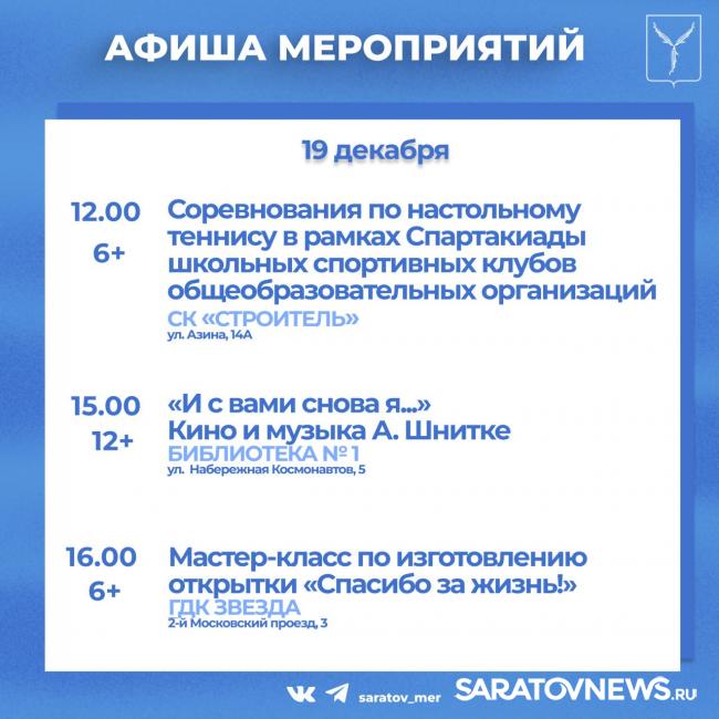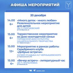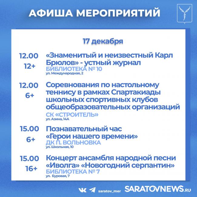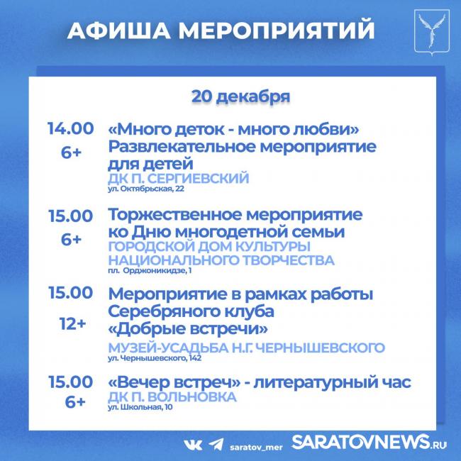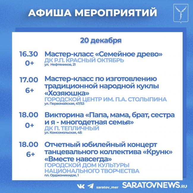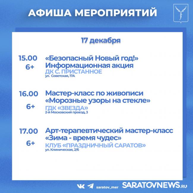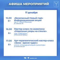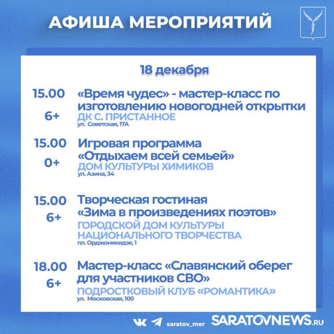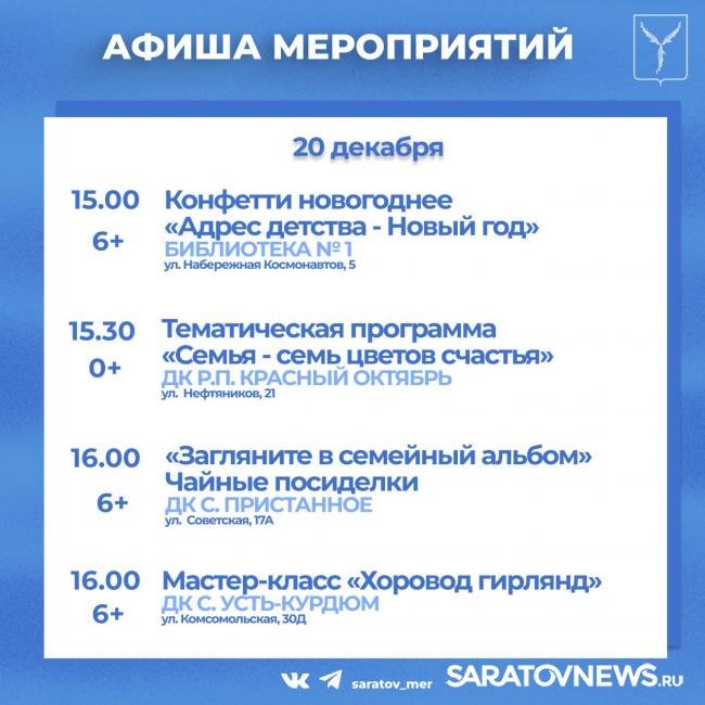 Совсем немного остается до встречи Нового года. Саратовцев приглашают посетить мероприятия, организованные учреждениями культуры города.