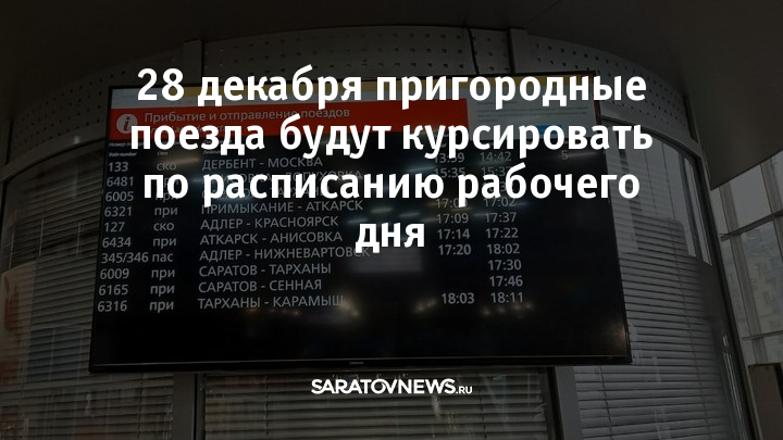 28 декабря пригородные поезда в Саратовской, Волгоградской и Астраханской областях будут курсировать по расписанию рабочего дня (несмотря на то, что данная дата является субботой). Об этом сообщает пресс-служба Приволжской железной дороги.