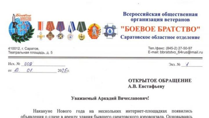 «Накануне Нового года на нескольких интернет-площадках появились объявления о сдаче в аренду здания бывшего саратовского аэровокзала. Основываясь на открытых источниках, смеем предположить, что указанное строение, имеющее славную историю, является одним из ваших бизнес-активов. В связи с этим мы, представители патриотической общественности Саратова, обращаемся к вам с призывом отказаться от решения коммерциализировать помещения без оглядки на моральную составляющую и цели его использования будущими арендаторами. Считаем, что здание, расположенное на Площади имени Героев Донбасса, где в День Героев Отечества был установлен памятник «Героям Донбасса», правильно было бы безвозмездно передать городу для организации в нем Музея защитников Отечества. Сегодня это востребовано и гораздо важнее любых товарно-денежных отношений.