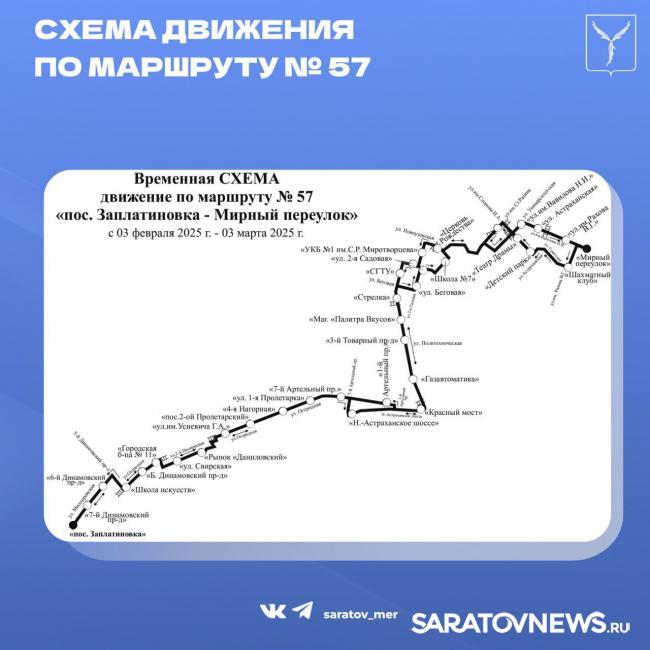 С понедельника, 3 февраля, В Саратове изменят схему движения автобусного маршрута № 57 (поселок Заплатиновка - Мирный переулок). Автобусы будут ездить через 7-й Артельный проезд, сообщает администрация города.