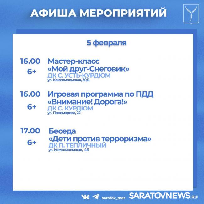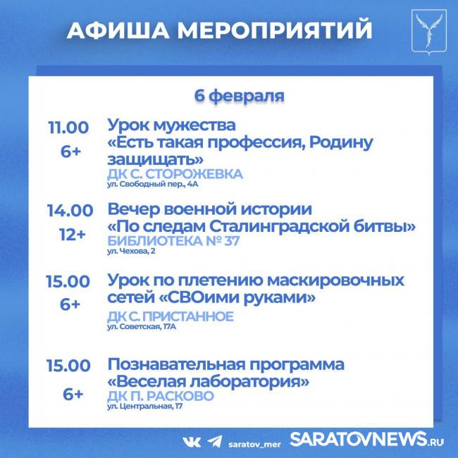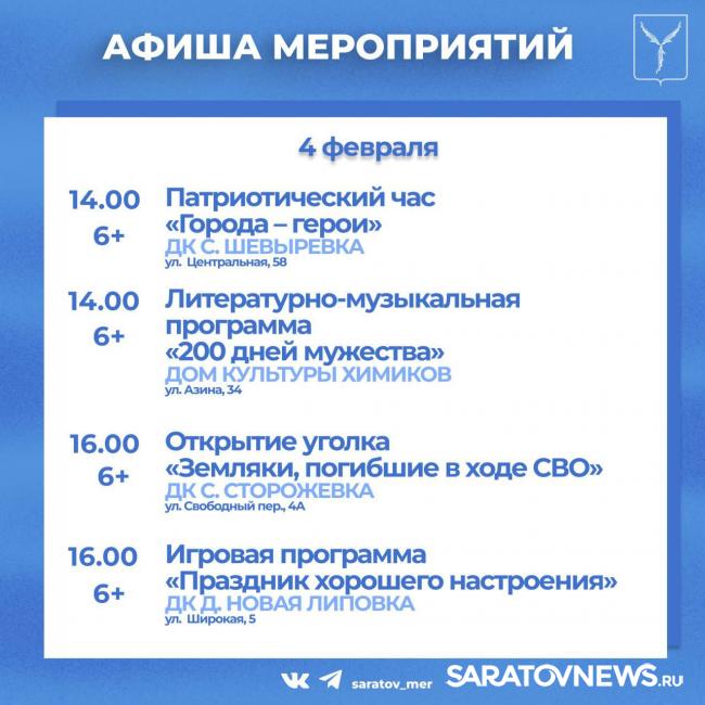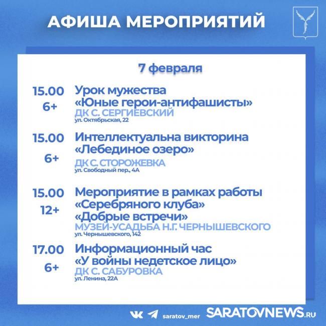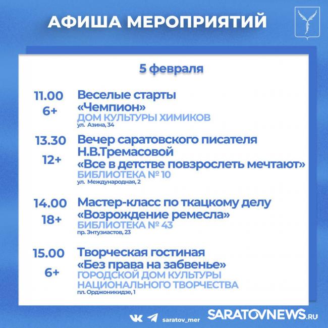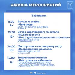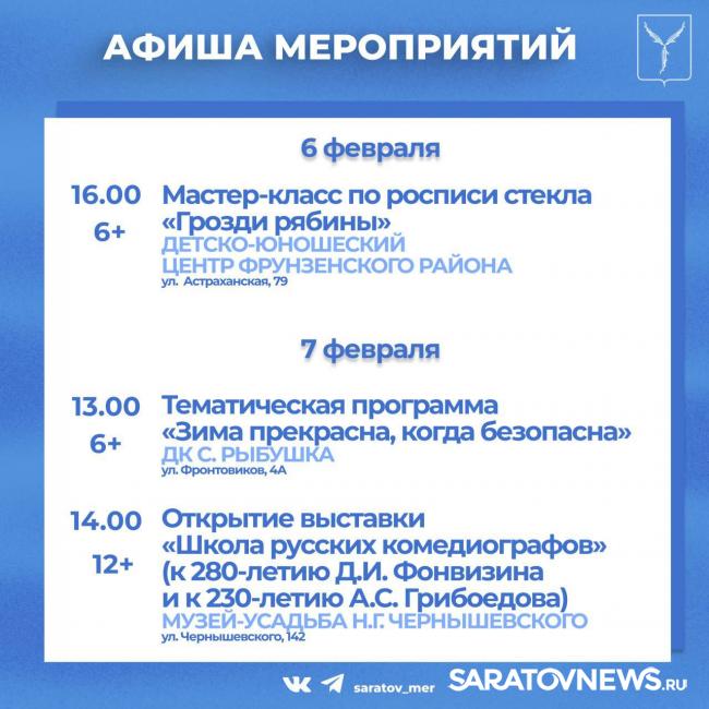 Жителей и гостей Саратова приглашают посетить мероприятия, организованные учреждениями культуры. Афишу мероприятий представила администрация города.