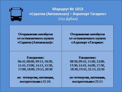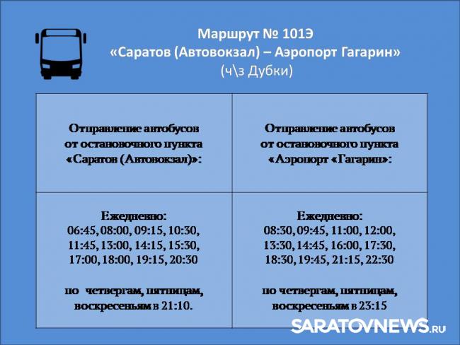 От остановки «Саратов (автовокзал)» автобусы будут уходить ежедневно в 6:45, 8:00, 9:15, 10:30, 11:45, 13:00, 14:15, 15:30, 17:00, 18:00, 19:15 и 20:30. По четвергам, пятницам, воскресеньям в 21:10.