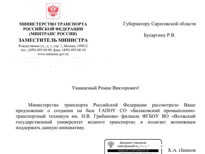Ранее встречался с замминистра транспорта РФ Константином Пашковым с тем, чтобы открыть филиал вуза на базе речного училища в Балаково. Он поддержал это предложение. Положительный ответ пришел на имя губернатора Романа Бусаргина.