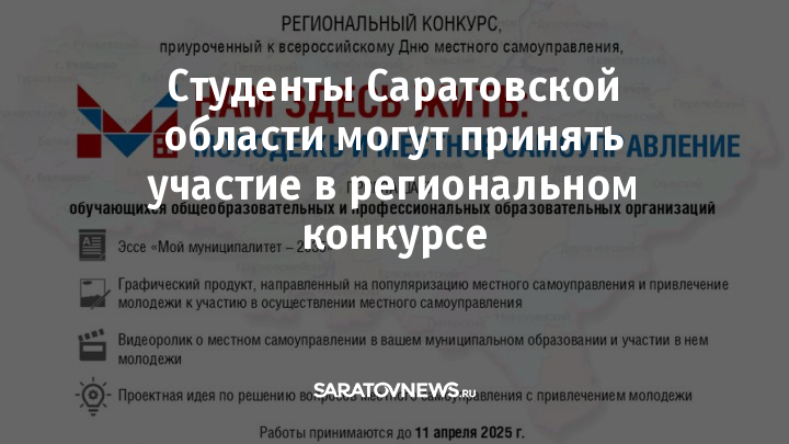 В Саратовской области с 1 февраля по 11 апреля проводится региональный конкурс работ обучающихся общеобразовательных и профессиональных образовательных организаций «Нам здесь жить: Молодежь и местное самоуправление».