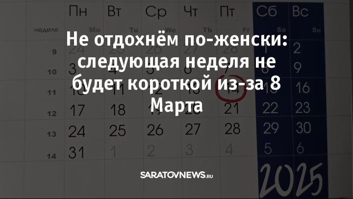 Саратовцев ждёт обычная рабочая неделя, несмотря на то, что 8 Марта приходится на субботу. Дело в том, что правительство РФ перенесло выходной с 8 марта, на пятницу, 13 июня. Зато пятница, 7 марта, станет короче на час — как предпраздничный день. Так что у женщин Саратова будет меньше времени на маникюр и выбор наряда, но больше — на работу.