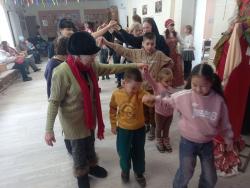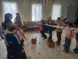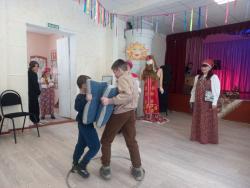 А затем взрослые и дети стали водить хоровод и играть в «Ручеек». И тут к гостям пришли Зима с Весной и стали приглашать маленьких участников праздника поучаствовать в конкурсах: отжимание, кто сильнее, бег на «конях» и, конечно же – традиционное перетягивание каната. Каждый ребенок на празднике получил сладкий подарок. В завершении мероприятия взрослые и дети смогли угоститься блинами с изумительным вареньем из земляники.