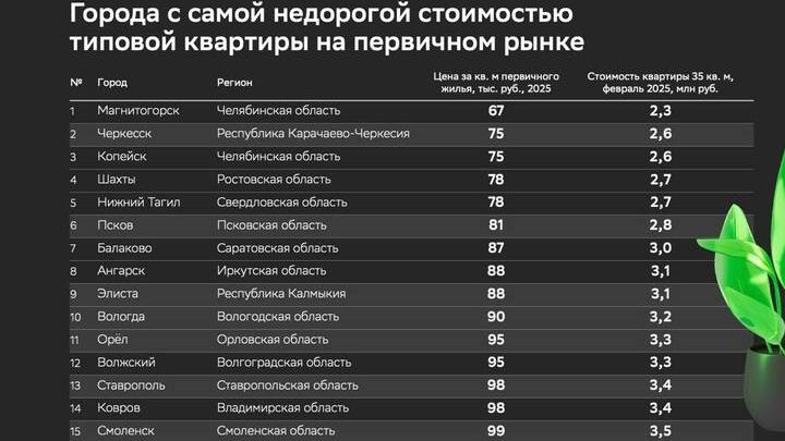 Лидером стал Магнитогорск (Челябинская область), где новую «однушку» можно приобрести за 2,3 млн рублей.