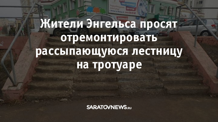 Жители Энгельса просят районные власти обратить внимание на рассыпающуюся лестницу на тротуаре в районе перекрестка улиц Волоха и Степной.