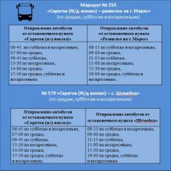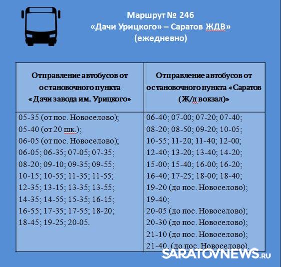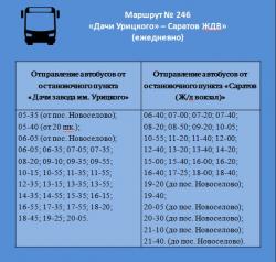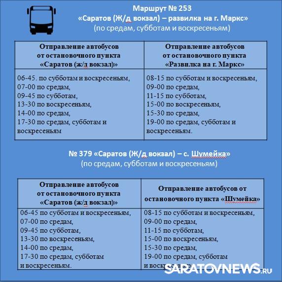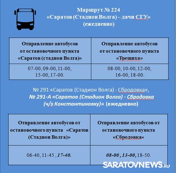Жители региона смогут добраться до дачных участков на автобусах маршрутов № 222 «Саратов (ул. Радищева) – Дачи СГУ», № 224 «Саратов (Стадион "Волга") - Трещиха», № 240 «Саратов (ул. Радищева) – п/т «Сокол», № 246 «Дачи завода имени Урицкого – Саратов (Ж/д вокзал)» № 253 «Саратов (Ж/д вокзал) – развилка на Маркс», № 299 «Саратов (Стадион "Волга") – Широкий Буерак» и № 379 «Саратов (Ж/д вокзал) – село Шумейка».