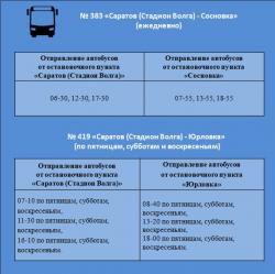 Также вводятся дополнительные рейсы на маршрутах № 283 «Саратов (Стадион "Волга") - Синенькие», № 285 «Саратов (Стадион "Волга") - 15 лет Октября», № 299 «Саратов (Стадион "Волга") – Широкий Буерак», № 348 «Саратов (площадь Ленина) - Малая Скатовка», № 445 «Саратов (ЦКР) - Усовка», № 463 «Саратов (ЦКР) - село Елшанка» и № 684 «Саратов (ЦКР) - Кошели» .