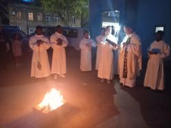 Навечерие Пасхи состоит из четырех частей. Первая – Литургия Света. Все верующие вышли во двор храма, где епископ, произнеся благословение, зажег свечу (пасхал) от костра. После этого верующие вернулись в храм и зажгли принесенные с собой свечи. Они символизировали свет Воскресения Христова.
