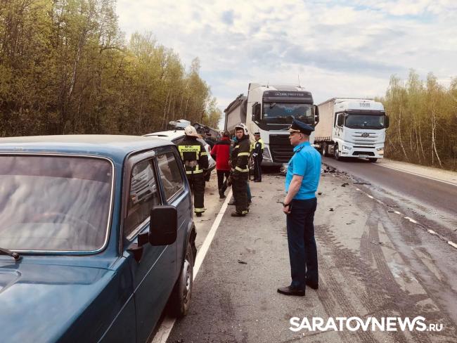 В результате женщина погибла на месте, водитель грузовика травмировался, его доставили в больницу. У шести машин отмечены механические повреждения, сообщает прокуратура Саратовской области.
