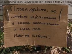 24 января 1944 года В. Н. Симбирцев погиб в бою во время ночного поиска в районе рудника имени Ленина на подступах к городу Кривой Рог Днепропетровской области УССР. Теперь же тротуар у его памятного знака превратился в стихийную парковку для электросамокатов. Видимо, отчаявшись бороться с водителями элетротранспорта, местные жители прикрепили к мемориалу рукописный «антипарковочный» плакат.