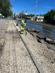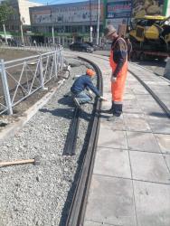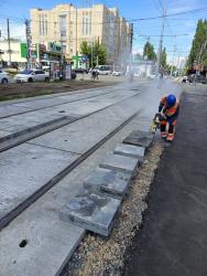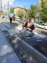 Работы проходят круглосуточно. Ночью рабочие укладывают крупногабаритные плиты около остановок. Рабочие также монтируют меньшие плиты, их помещают между рельсами. Кроме того, монтируются лотки ливневки и прокладываются оптические кабели. Днем на объектах работают порядка 90 специалистов и 30 единиц техники. В ночное время задействовано 50 рабочих и 20 единиц техники.