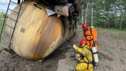 "Водитель не пострадал. На месте происшествия группа спасателей-химиков областной службы спасения с помощью крана и погрузчика устраняет последствия", - сообщил начальник службы спасения региона Никита Зрада.
