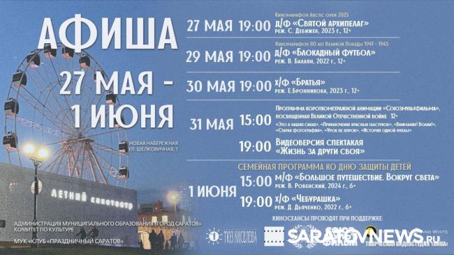 Представлена афиша на предстоящую неделю летнего кинотеатра на Новой набережной Саратова.