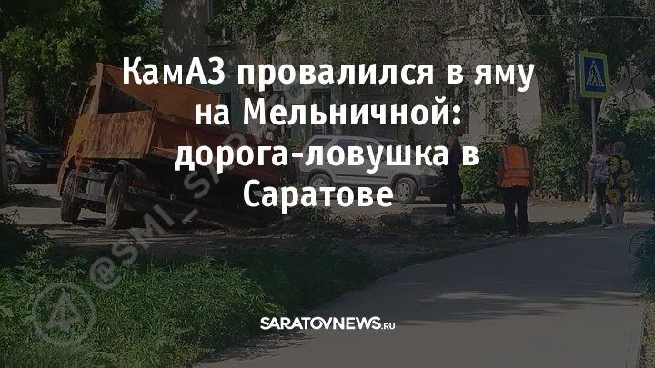 Опасный инцидент произошел сегодня на улице Мельничной, 43. Грузовик КамАЗ, который судя по окраске принадлежит коммунальным службам, частично провалился задним колесом в глубокую дорожную яму во дворе жилого дома. Кадры ЧП опубликовал телеграм-канал «Новости Саратова и Области» после обращения очевидца.