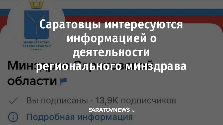 В Саратовской области растет число жителей, интересующихся информацией о деятельности регионального министерства здравоохранения. В скором времени число подписчиков официальной страницы ведомства превысит 14 тысяч человек. Горожане и жители районов узнают здесь новости регионального здравоохранения, истории спасения пациентов, о ходе реализации национальных проектов, о работе подведомственных лечебных учреждений, проводят опросы по актуальным темам. Также для любителей головоломок представлены шарады и ребусы на медицинскую тематику.