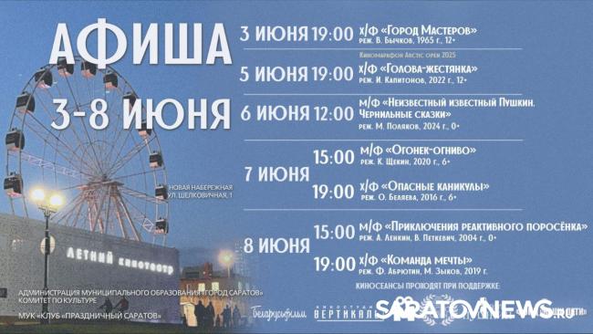 В Саратове представили афишу Летнего кинотеатра на неделю. В программе как классические, так и современные картины, которые подойдут для всей семьи, сообщили в мэрии.