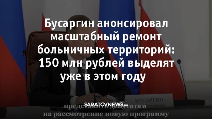 Губернатор Саратовской области Роман Бусаргин объявил о запуске новой трехлетней программы по ремонту прилегающих территорий крупных медицинских учреждений региона. На первый этап, который стартует в 2025 году, планируется направить 150 миллионов рублей. «Это решение войдет в бюджетные поправки, которые рассмотрят в областной думе. Уверен, что коллеги поддержат инициативу, ведь речь идет о здоровье и комфорте жителей», — заявил глава региона.