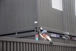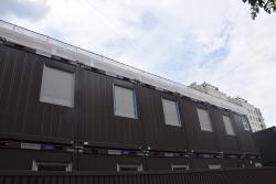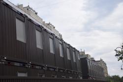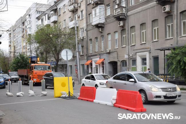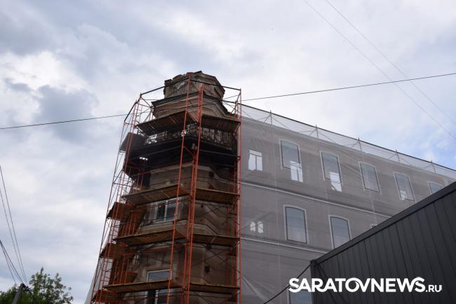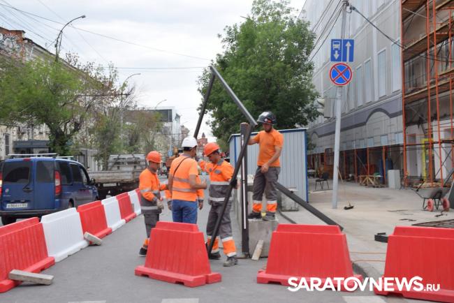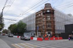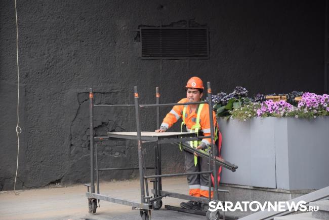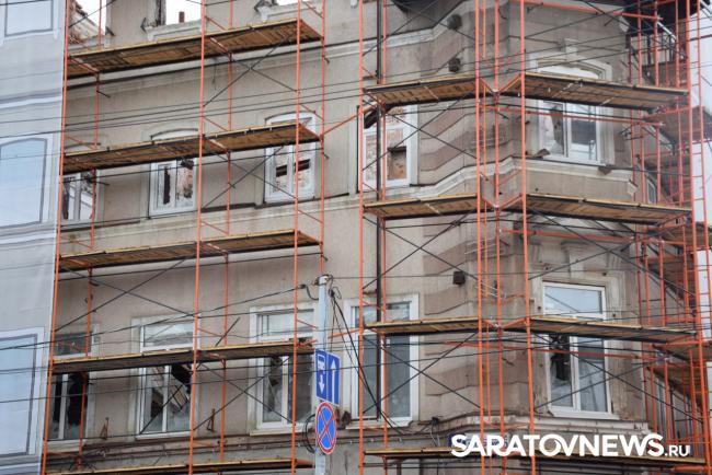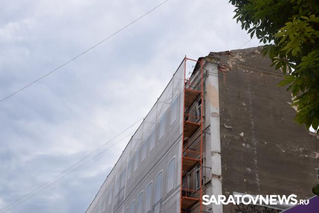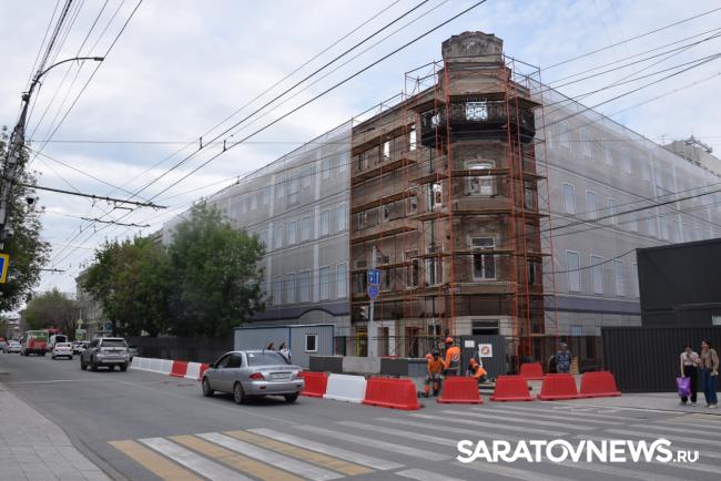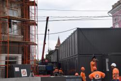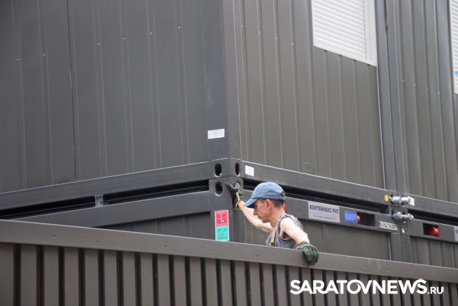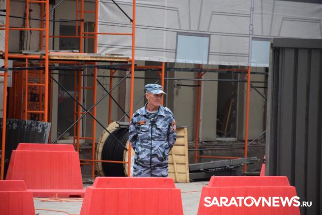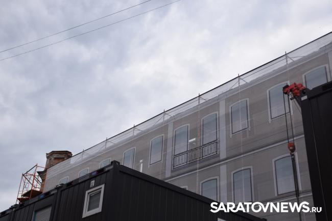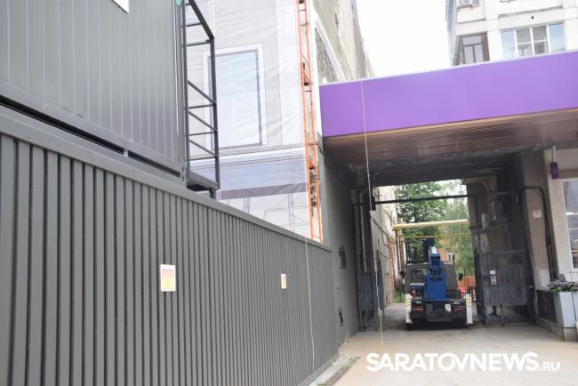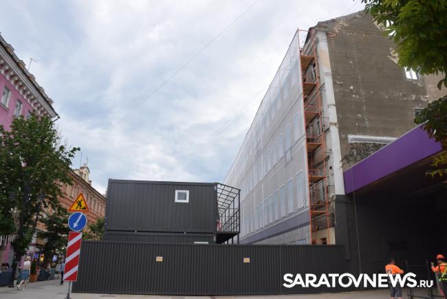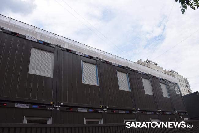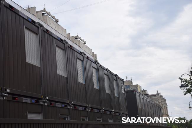 В Саратове стартовала реставрация бывшей гостиницы «Россия» на проспекте Столыпина. Рабочие установили двухэтажные вагончики, которые заняли половину пешеходной зоны. Теперь горожанам приходится обходить их по узкому проходу между временными постройками и верандами летних кафе.