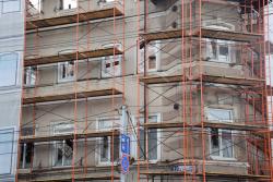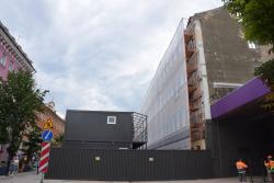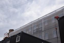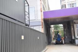 Сейчас гостиница закрыта строительными лесами и фальшфасадом. За ограждением с табличкой «Балтийская инжиниринговая компания» идут подготовительные работы.