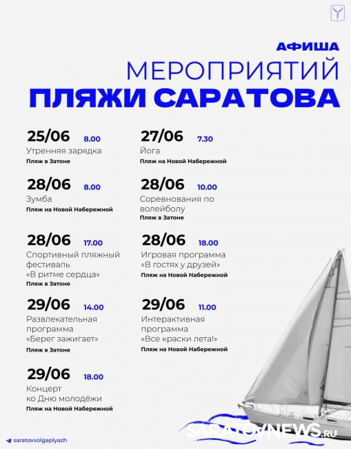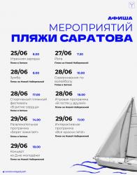 Для саратовцев подготовлена афиша мероприятий, которые пройдут на пляжах Саратова в течение недели. О мероприятиях рассказали в телеграм-канале "Саратов. Волга. Пляж".