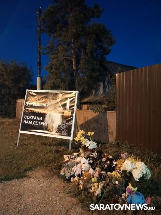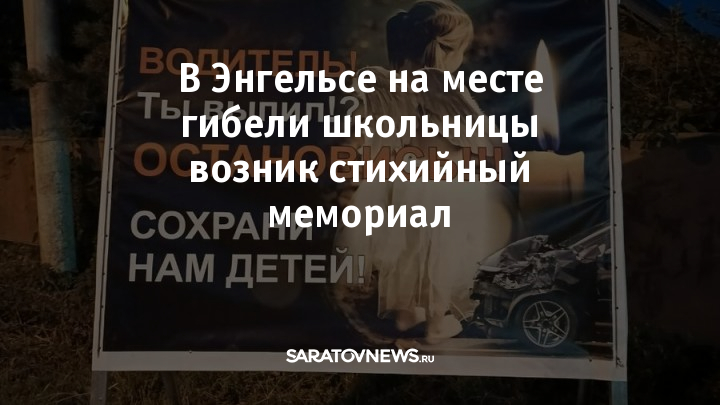В Энгельсе на месте гибели 15-летней школьницы возник стихийный мемориал. Люди приносят к фотографии девочки игрушки и цветы. Здесь также размещен баннер для водителей.