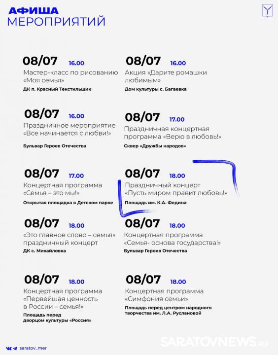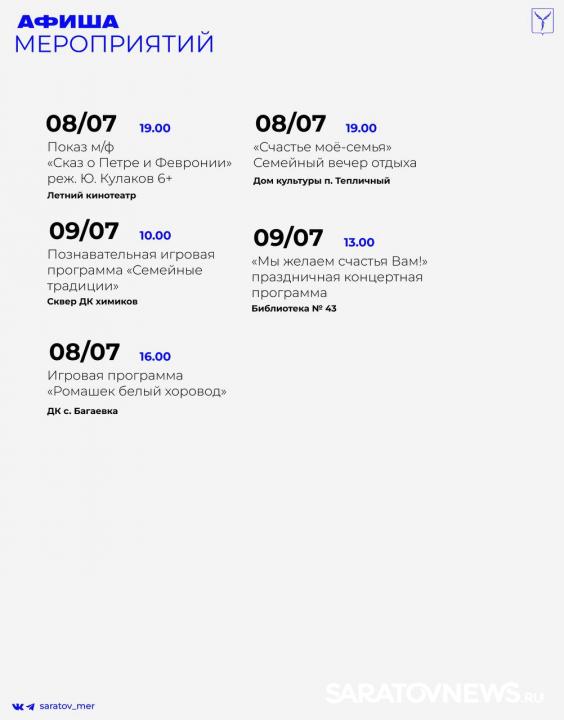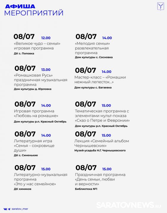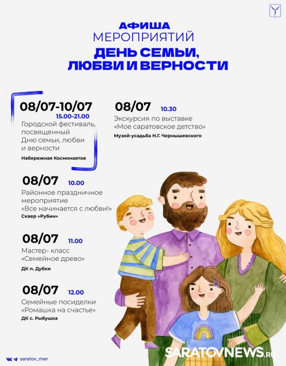 В преддверии Дня семьи, любви и верности, который отмечается 8 июля, в Саратове подготовлены праздничные мероприятия. Об этом рассказали в мэрии.