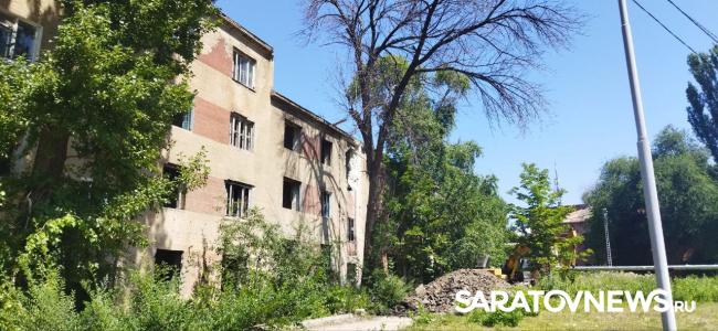 В Заводском районе Саратова сносят аварийный дом. Подъехала техника. Полуразрушенное аварийное здание расположено на проспекте Энтузиастов, 6 около храма Тихвинской иконы Божией Матери.