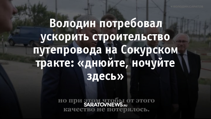 Вячеслав Володин в ходе рабочей поездки в Саратов провёл совещание по одному из ожидаемых городских проектов — строительству путепровода через железнодорожные пути по Сокурскому тракту. Спикер Госдумы подчеркнул, что финансирование уже выделено, и теперь дело за реализацией.
