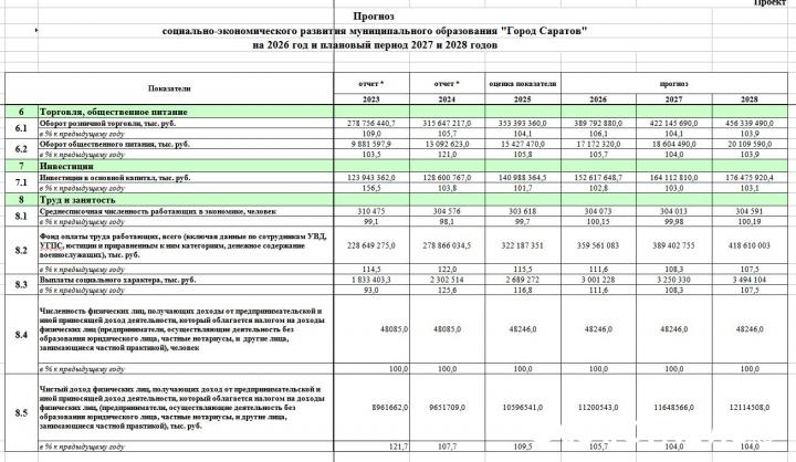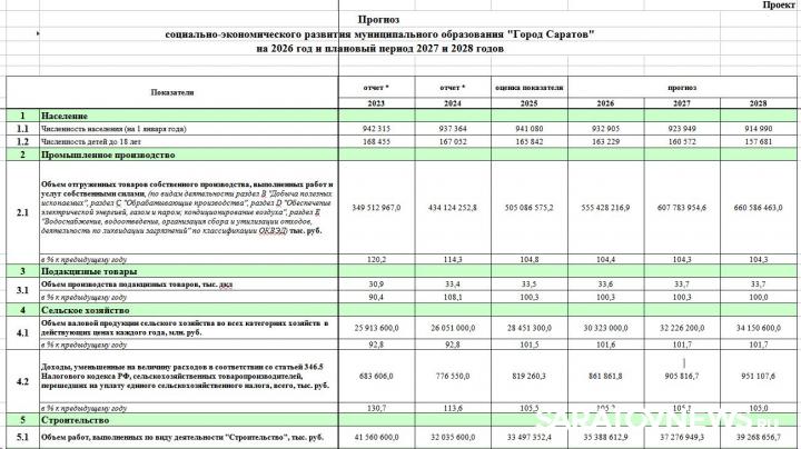 Администрация Саратова опубликовала проект прогноза социально-экономического развития города на 2026 год и плановый период 2027–2028 годов. Документ размещён на официальном сайте мэрии и включает ключевые демографические и экономические показатели.