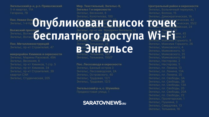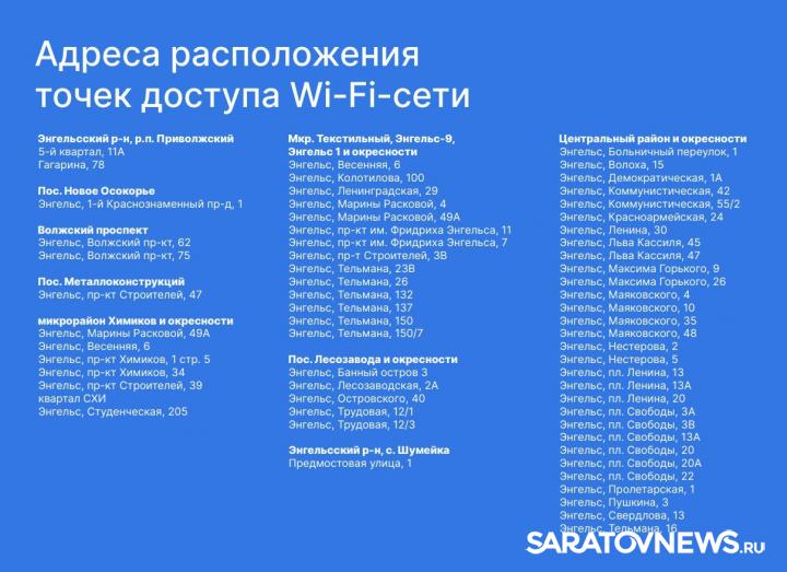 Администрация Энгельсского района опубликовала список точек доступа к бесплатному Wi-Fi. Зона покрытия будет постоянно расширяться.