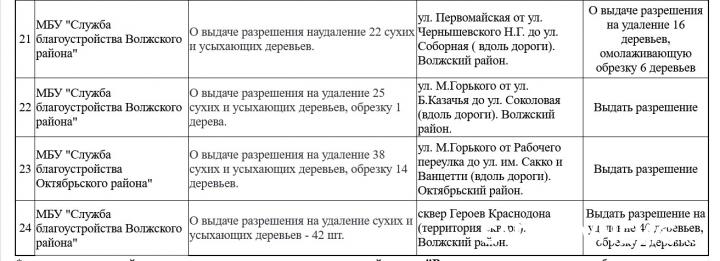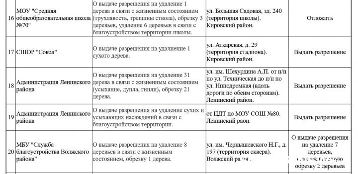 Наибольший объем работ предстоит на улице Соколовой — от Горького до Хвалынской здесь спилят 97 деревьев. В сквере Героев Краснодона (Волжский район) уберут 40 сухостойных экземпляров. На улице Горького — от Рабочего переулка до Сакко и Ванцетти — исчезнут 38 деревьев, а на улице Шехурдина от Технической до Ипподромной — еще 31.