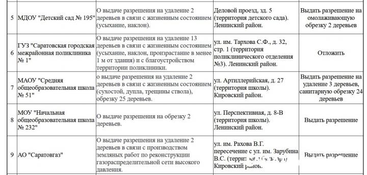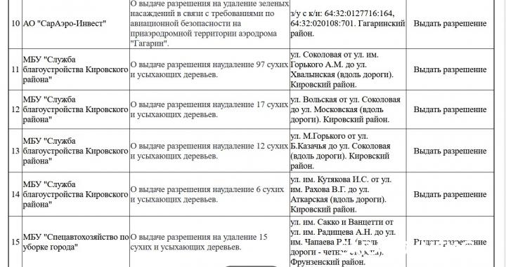 Полный перечень адресов и количество деревьев доступны в иллюстрациях к новости. Среди прочих объектов: территория аэропорта "Гагарин" (Гагаринский район), участок вдоль Первомайской от Чернышевского до Соборной (22 дерева), а также зона от ЦДТ до школы №80 в Ленинском районе.
