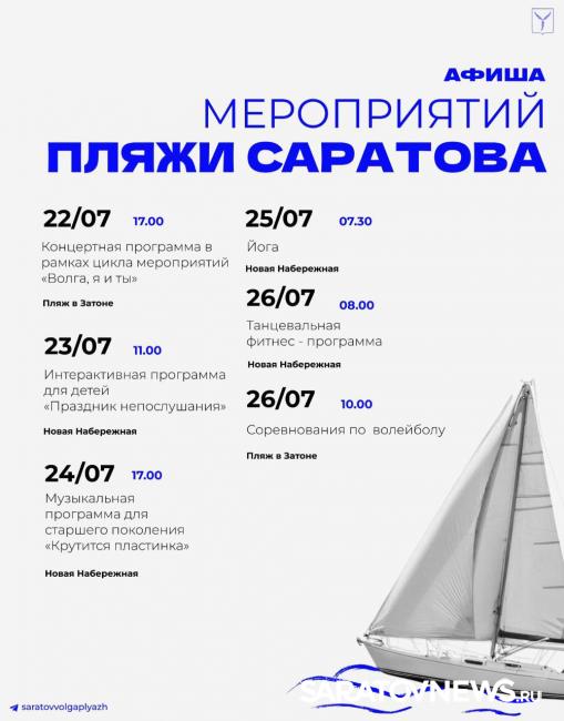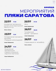 На пляжах Саратова с 22 по 26 июля пройдет серия культурных и спортивных мероприятий для разных возрастных групп. Афишу опубликовала администрация города.