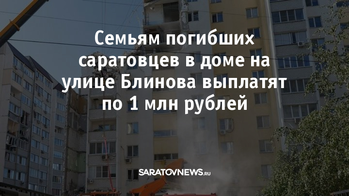 В Саратове семьям погибших в доме на улице Блинова из резервного фонда правительства региона выплатят по 1 млн рублей.